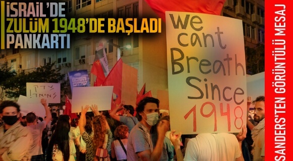Protestoda, ABD’de polis şiddeti sonucu hayatını kaybeden siyahi George Floyd’un son sözlerine atıfta bulunularak “1948’den bu yana nefes alamıyoruz.” pankartı açıldı.