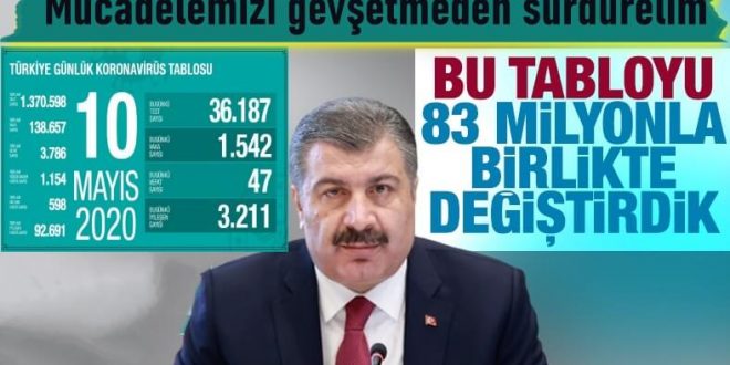 Sağlık Bakanı Fahrettin Koca, güncel verileri, “Bu tabloyu 83 milyon birlikte değiştirdik. Tedbirlere ısrarla uyarak! Mücadelemizi ciddiyetle, hiç gevşetmeden sürdürelim. İyileşen hasta sayımız yakında 100 bin kişiyi bulacak. Vefat sayımız, vaka sayımız gittikçe azalacak. Biraz daha özveriye değmez mi?” notuyla paylaştı.