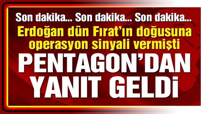 Türkiye’nin Suriye’de Fırat’ın doğusunda operasyona hazırlandığı sinyali veren açıklamalarına ABD Savunma Bakanlığı Pentagon’dan yanıt geldi. Pentagon sözcüsü Sean Robertson, ‘’Türkiye’nin Suriye’nin kuzeydoğusuna yönelik operasyon planları hakkındaki açıklamalarının farkındayız. Türkiye ve Suriye Demokratik Güçleri’yle (SDG) durumu yatıştırmak amacıyla temas halindeyiz’’ açıklamasında bulundu.