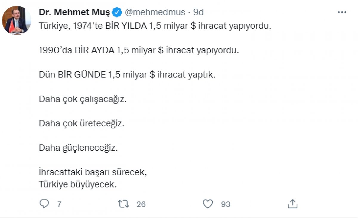 Ticaret Bakanı Mehmet Muş, Twitter hesabından yaptığı açıklamada, “Türkiye, 1974’te bir yılda 1,5 milyar dolar ihracat yapıyordu. 1990’da bir ayda 1,5 milyar dolar ihracat yapıyordu.
