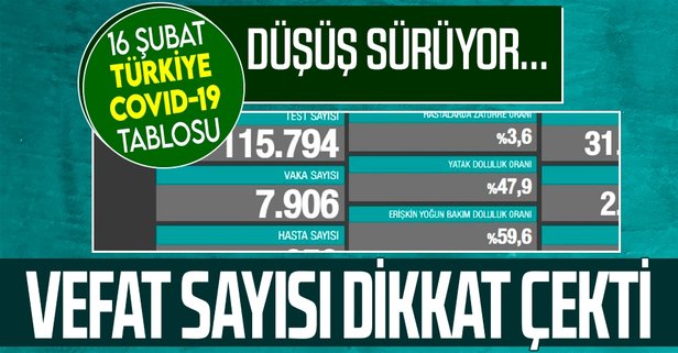 Sağlık Bakanlığı tarafından 16 Şubat koronavirüs tablosu, vaka, hasta, test, vefat sayısı ve son durum açıklandı. Türkiye’de son 24 saatte 115 bin 794 Kovid-19 testi yapıldı, 7 bin 906 kişinin testi pozitif çıktı, 90 kişi hayatını kaybetti.