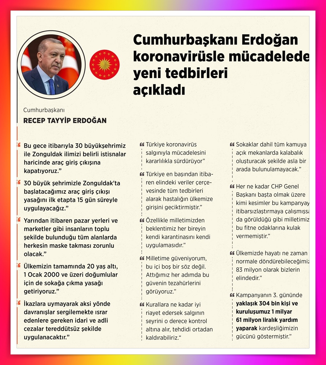 Erdoğan, “Amacımız vatandaşımıza eziyet etmek değil, hem kendi sağlığını hem de onlarla temas edenlerin sağlığını güvence altına almaktır. Ülkemizde hayatı ne zaman normalde döndürebileceğimiz 83 milyon olarak bizlerin elindedir. Kurallara ne kadar iyi riayet edersek, salgının seyrini o derece hızlı kontrol altına alır ve tehdidi tamamen ortadan kaldırabiliriz. Aksi halde bugün üzüntüyle takip ettiğimiz kimi ülkelerin durumuna düşmemiz kaçınılmazdır. Milletime güveniyorum. Attığımız her adımda bu güvenin tezahürlerine şahit olabiliyoruz.” dedi.