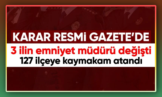 Adana, Iğdır ve Siirt’e yeni emniyet müdürü atanması ve 127 ilçeye de yeni kaymakam görevlendirilmesine dair Cumhurbaşkanı kararı Resmi Gazete’de yayınlanarak yürürlüğe girdi.
