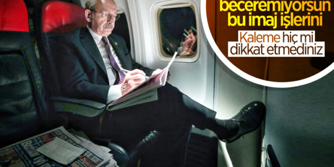 Kemal Kılıçdaroğlu’nun bir şeyler yazdığı gösterilmek istendi ancak CHP Lideri’nin elindeki kalemin ucu dahi kapalıydı. Fotoğrafta; Kemal Kılıçdaroğlu’nun yanında bazı gazetelerin ve koronavirüse karşı taktığı maskenin bulunduğu görülüyor. Business Class’ta uçtuğu görülen Kemal Kılıçdaroğlu bu pozuyla, ekonomi sınıfında uçtuğu yönündeki paylaşımlarla da çelişti.