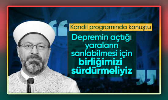 Erbaş, konuşmasını şöyle sürdürdü: Geçen yıl bu vakitlerde yaşadığımız depremin acısı hala yüreklerimizde. Bu ağır afet karşısında milletimiz büyük bir dayanışma örneği sergilemiştir.