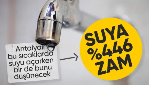 Antalya Büyükşehir Belediyesi temmuz ayı olağan devam meclis toplantısında suyun birim fiyatına yüzde 446 oranında zam yapıldı. Meskenlerde 5 metreküpe kadar 1,83 lira olan suyun birim fiyatı 10 lira oldu.