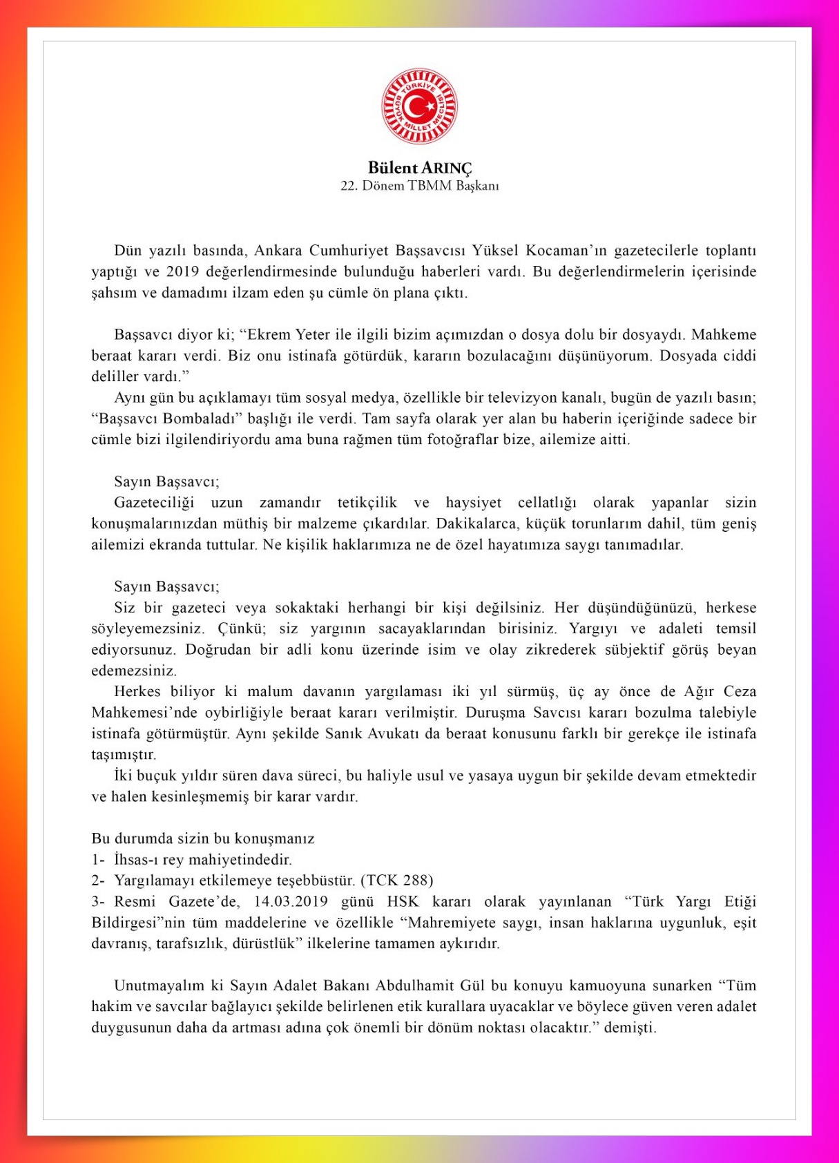 Bülent Arınç ise, Ankara Cumhuriyet Başsavcısı Yüksel Kocaman’ın dünkü sözlerine ilişkin bugün bir yanıt verdi.