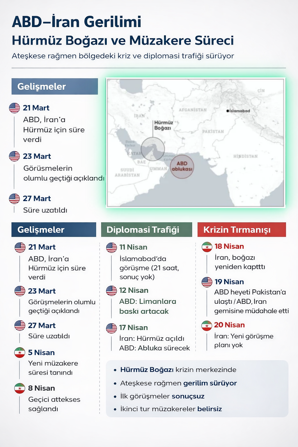 İran, ateşkes kapsamında Hürmüz Boğazı’nı geçişlere açtığını duyurmuştu. Buna karşılık Trump, İran ile kapsamlı bir anlaşmaya varılana kadar bölgedeki ablukanın süreceğini açıkladı. Bu çıkışın ardından boğaz yeniden kapatıldı.