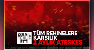 İsrail, tüm rehinelerin serbest bırakılması karşılığında Gazze’de saldırılara 2 ay ara verilmesini teklif etti.. İsrail’in abluka altındaki Gazze Şeridi’ne yönelik saldırıları 3 ayı aşkın süredir devam ediyor. Katliamlarına geçen süre zarfında yenilerini ekleyen İsrail, 23 binden fazla sivili hayattan kopardı. Okul, hastane, ibadethane ve sivil yerleşim alanlarını hedef gözetmeksizin vuran …