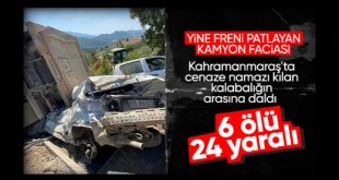 Kahramanmaraş’ta freni patlayan kamyon cenaze namazı kılanların arasına daldı. Kazada 6 kişi hayatını kaybederken 24 kişi yaralandı. Kahramanmaraş’ta feci bir kaza yaşandı. Andırın ilçesine bağlı kırsal Darıobası Mahallesi’ndeki Davut Avan’ın cenazesi için Kavaklı Mezarlığı’nda tören düzenlendi. Kamyon kalabalığa daldı Törene katılmak için halkın toplandığı sırada, Kahramanmaraş-Andırın kara yolundan gelen bir …