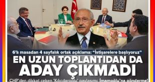 Muhalefet partilerinin bir araya gelerek oluşturduğu altılı masa, 10’uncu kez bir araya geldi. Bugüne kadar yapılanlar arasında 9 saat ile en uzun süren toplantı sonrası yapılan açıklamada, “Geçiş sürecine ilişkin yol haritası 30 Ocak’ta ortak tanıtım toplantısıyla kamuoyuyla paylaşılacak” denildi. Adaylık konusunda bir kez daha bir açıklama yapılmadı. Açıklamada çoklu …