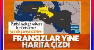 Fransız kanalında küstah Türkiye haritası. Fransa’da yayın yapan France24 kanalı, Türkiye’nin bir bölümünü Kürdistan olarak gösteren bir harita yayınladı. PKK sempatizanları, geçtiğimiz haftalarda Fransa’nın başkenti Paris’te silahlı saldırılarda bulunmuş, 3 kişi hayatını kaybetmiş, 35’ten fazla polis yaralanmıştı.. Ancak Fransa, saldırılardan ders çıkarmamış olacak ki hala PKK’lılara desteğini sürdürüyor. Türkiye’ye karşı …