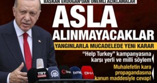 Cumhurbaşkanı Recep Tayyip Erdoğan, cuma namazı sonrası gazetecilere açıklamada bulundu. Erdoğan birçok ilimizde meydana gelen orman yangınlarına ilişkin son durumu paylaştı. Cumhurbaşkanı Erdoğan, sosyal medyada orman yangınlarıyla ilgili "Help Turkey" etiketiyle yapılan paylaşımlara ilişkin, "Help Turkey diye bir kampanya başlattılar. Bunun karşısında söyleyeceğimiz tek şey var, güçlü Türkiye. Nitekim fazla dayanamadılar kısa sürede Help Turkey'i [...]