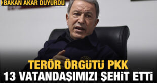 Haberin Detayı İçin TıklayınızBakan Akar duyurdu: Bölücü terör örgütü PKK, 13 vatandaşımızı şehit etti