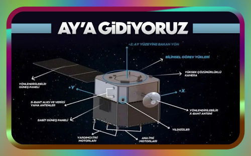 Türkiye Uzay Ajansının (TUA) uzay aracı görselinin yer aldığı paylaşımında, yönlendirilebilir güneş paneli, S-Bant alıcı ve verici yama antenler, sabit güneş paneli gibi bileşenler gösterildi.