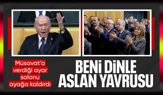Müsavat Dervişoğlu’nun MHP’ye yönelik sözlerine sert ifadelerle yanıt veren Devlet Bahçeli’nin, “Bir lafına bakıyorum laf mı diye, bir de söyleyene bakıyorum adam mı diye!” sözleri salonda ayakta alkışlandı.