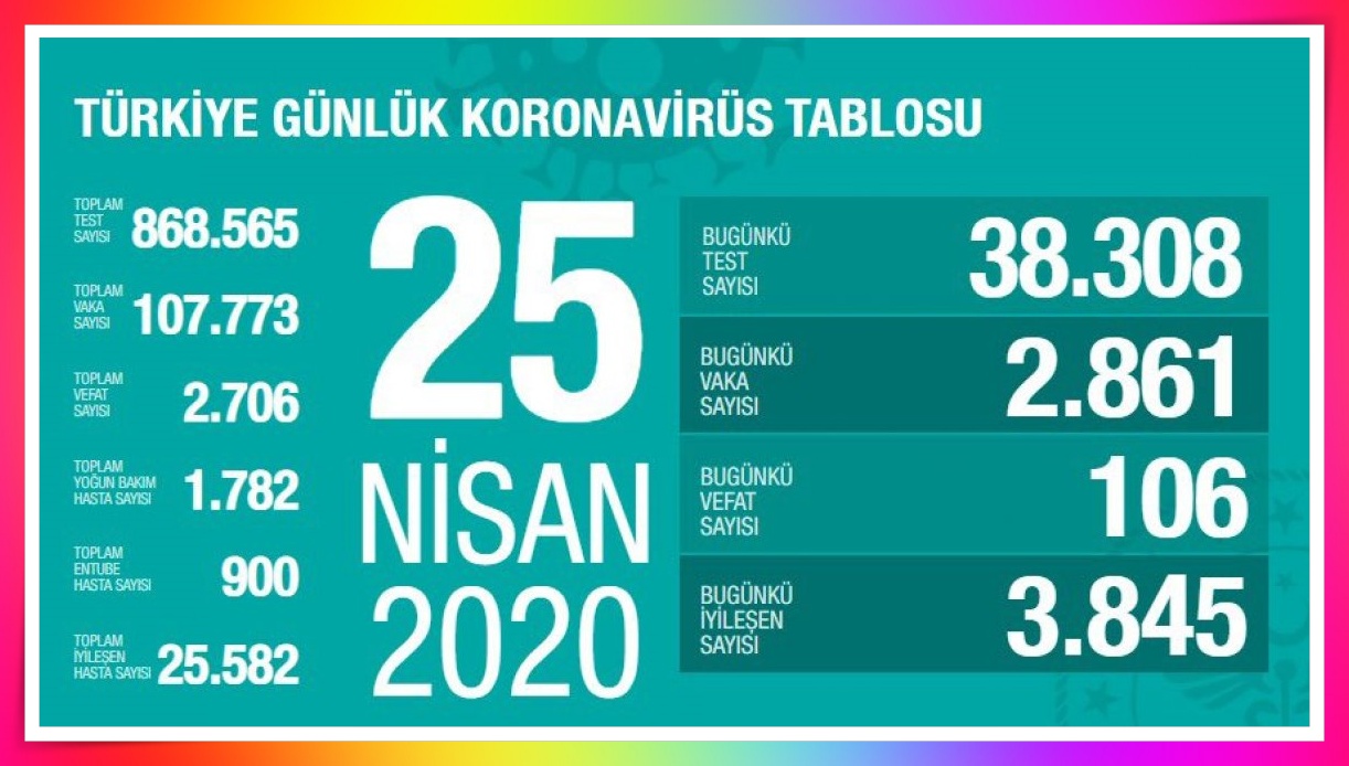 Son 24 saatte 106 hasta vefat etti, 3 bin 845 hasta ise iyileşti. Toplam test sayısı 868 bin 565, toplam vaka sayısı 107 bin 773, toplam vefat sayısı 2 bin 706, toplam yoğun bakım hasta sayısı 1782, toplam entübe hasta sayısı 900, toplam iyileşen hasta sayısı 25 bin 582 oldu.