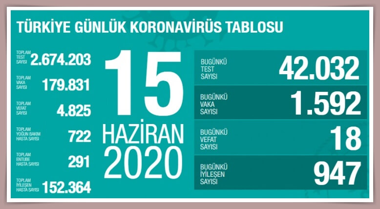 Sağlık Bakanlığı tarafından 15 Haziran koronavirüs tablosu, vaka, test, vefat sayısı ve son durum açıklandı. Türkiye’de son 24 saatte 1592 kişiye Kovid-19 tanısı konuldu, 18 kişi hayatını kaybetti, toplam vaka sayısı 179 bin 831, can kaybı 4 bin 825 oldu. Bakan Koca, artışların belli bir bölgede yoğunlaştığını belirterek uyarılarda bulundu.