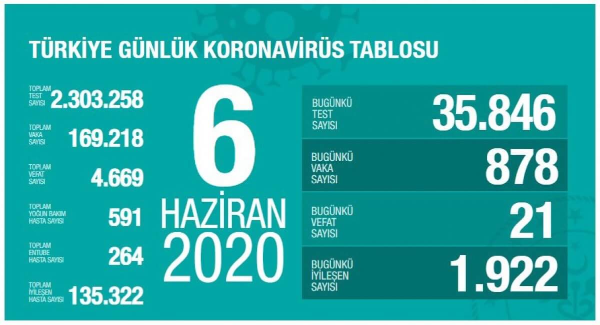 Sağlık Bakanlığı tarafından 6 Haziran koronavirüs tablosu, vaka, test, vefat sayısı ve son durum açıklandı. Türkiye’de son 24 saatte 878 kişiye Kovid-19 tanısı konuldu, 21 kişi hayatını kaybetti, toplam vaka sayısı 169 bin 218, can kaybı 4 bin 669 oldu. Bakan Koca değerlendirmesinde toplam vakaların yüzde 80’inin iyileştiğini açıkladı.