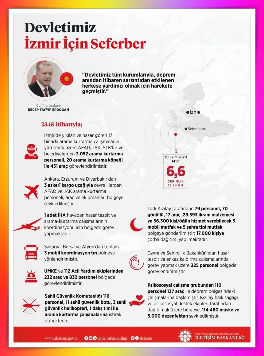 Cumhurbaşkanı Erdoğan programdaki konuşmasında, “İzmir Seferihisar açıklarında meydana gelen 6.6 büyüklüğündeki depreme maruz kalan İzmir’e ve çevre şehirlerde yaşayanlara geçmiş olsun dileklerimiz iletiyorum. Vefat sayımız 12 idi, yaralı sayımızı 438 idi ve bunlar içerisinde 5 vatandaşımız ameliyatta 8 olan vatandaşımız yoğun bakımdaydı.17 binada arama çalışmalarımız devam ediyor. Devletimiz, bakan arkadaşlarımız, tüm kurumlarıyla deprem anından itibaren yıkıntı altında kalan vatandaşlarımızı kurtarmak için harekete geçmiştir. AFAD, sağlık birimlerimiz ve diğer ilgili kamu personeli canla başla görevini yapıyor. Bakanlarımız koordinasyonu sağlamak için İzmir’e ulaşmıştır. Henüz evlerine giremeye vatandaşlarımıza gereken desteği sağlıyoruz. Sosyal Yardımlaşma ve Dayanışma Vakfına gereken kaynak hemen aktarılmıştır” dedi.
