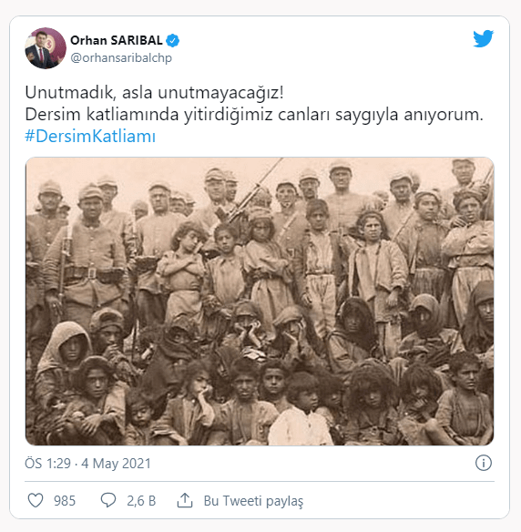 CHP Bursa Milletvekili ve Parti Meclisi Üyesi Orhan Sarıbal, Dersim katliamıyla ilgili sosyal medyadan paylaşım yaptı. Sarıbal, “Dersim katliamında yitirdiğimiz canları saygıyla anıyorum” ifadelerini kullandı.