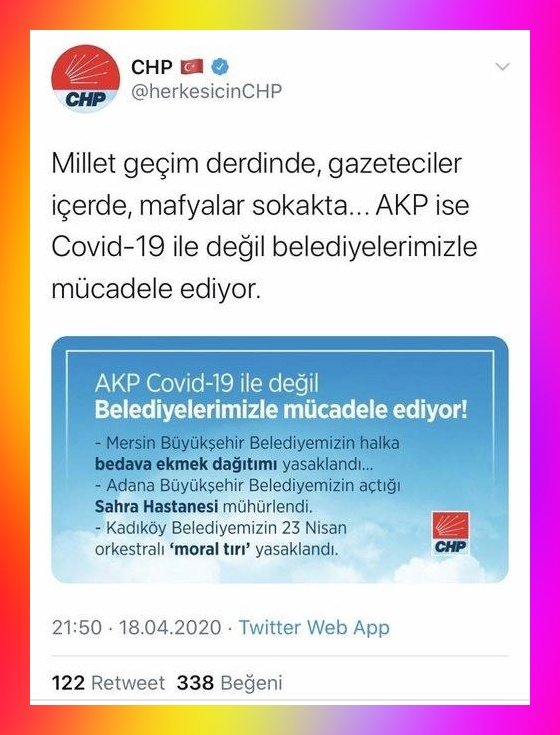Cumhuriyet Halk Partisi, Türkiye’de koronavirüs salgınına rağmen yalan ve algı operasyonuna devam ediyor. CHP Genel Merkezi’nin kurumsal hesabından, Mersin’de belediyelerin ekmek dağıtmasının yasaklandığı yalanı paylaşıldı.