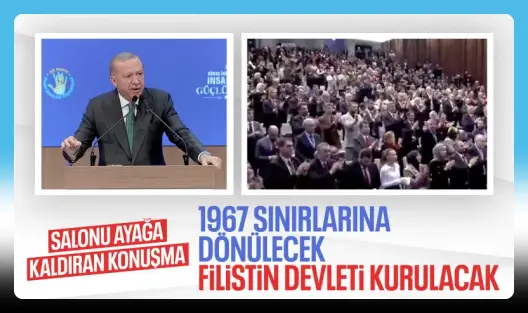 Filistin’e yönelik mesajları salon tarafından ayakta alkışlanan Erdoğan, Türkiye’nin bölgedeki dayanışmayı sürdüreceğini ve desteklerin iş birliği içerisinde devam edeceğini kaydetti.