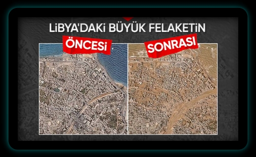 Sel felaketinin vurduğu Libya’da Derne şehrinin felaketten önce ve sonra çekilen havadan görüntüsü, yıkımın büyüklüğünü gözler önüne serdi.