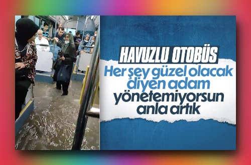 Yolculardan birinin cep telefonu kamerasına yansıyan görüntülerde seyir halindeki İETT otobüsünün içerisine yağmur suları doldu.