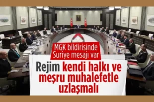 Son dakika haberine göre, Cumhurbaşkanı Erdoğan başkanlığındaki MGK toplantısı sonrası yapılan 5 maddelik yazılı açıklamada Suriye’deki gelişmelerle ilgili rejimin kendi halkı ve meşru muhalefet ile uzlaşması gerektiği vurgulandı.. Milli Güvenlik Kurulu, Cumhurbaşkanı Recep Tayyip Erdoğan başkanlığında toplandı. Beştepe’de gerçekleşen toplantı yaklaşık 3 saat sürdü. Suriye’de Heyet Tahrir eş-Şam, kısa adıyla HTŞ ve …