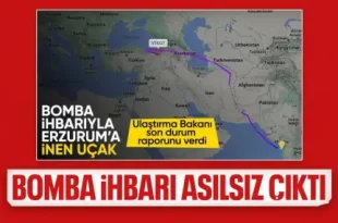 Hindistan’dan Almanya’ya giden ve bomba ihbarı nedeniyle Erzurum’a zorunlu iniş yapan yolcu uçağındaki arama çalışmalarının ardından, yapılan bomba ihbarının asılsız olduğu açıklandı. Erzurum Havalimanı üzerindeki uçuş yasağı ise kaldırıldı. Hindistan’ın Mumbai kentinden Almanya’nın Frankfurt kentine giden Vistara Hava Yolları’na ait yolcu uçağı Erzurum’a acil iniş yaptı. Ulaştırma ve Altyapı Bakanı …