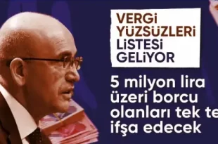 Her bir vergi dairesine 5 milyon lira ve üzerinde vergi borcu ve cezası bulunan mükelleflerin isimleri, kamuoyu ile paylaşılacak. Hazine ve Maliye Bakanı Mehmet Şimşek, listelerin asılmasına 1 aylık zaman olduğunu hatırlatarak “vergi yüzsüzü olunmaması için” uyarıda bulundu. Hazine ve Maliye Bakanlığı 5 milyon lira ve üzerinde vergi borcu ve …