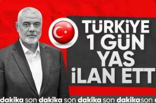 Son dakika haberine göre, Hamas lideri İsmail Heniyye’nin şehit olması nedeniyle Türkiye’de 1 günlük yas ilan edildi… Son dakika haberine göre, Cumhurbaşkanı Recep Tayyip Erdoğan, Hamas Siyasi Büro Başkanı İsmail Heniyye’nin şehadeti nedeniyle, yarın 1 günlük milli yas ilan edildiğini açıkladı. YURT GENELİNDE 1 GÜNLÜK YAS Cumhurbaşkanı Erdoğan’ın paylaşımı şöyle: …