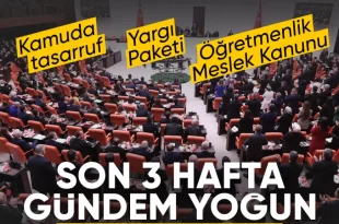 Ay sonunda tatile girmesi beklenen TBMM’de Öğretmenlik Meslek Kanunu görüşmeleri başlayacak. 9’uncu Yargı Paketi’nin ilk görüşmeleri, Adalet Komisyonu’nda yapılacak. Plan ve Bütçe Komisyonu’nun gündeminde ise kamuda tasarruf tedbirlerine ilişkin düzenleme var. Öğretmenlere yönelik şiddetin önlenmesi, yargısal süreçlerin hızlandırılmasına yönelik düzenlemeler ve kamuda tasarruf tedbirleri… Bu hafta hem Meclis Genel Kurulu’nda …