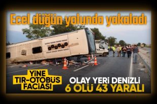Denizli’de kontrolden çıkan karayollarına ait kum yüklü tırın, bariyerleri yıkıp karşı şeride geçerek seyir halindeki yolcu otobüsüne çarpması sonucu 6 kişi öldü, 43 kişi yaralandı. Denizli’de sabah 05.00 sıralarında Honaz ilçesine bağlı Dereçiftlik Mahallesi’nde, Afyon’dan Denizli yönüne seyir halinde olan karayollarına ait kum yüklü 06 CJE 049 plakalı tır, sürücüsünün …