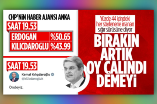 Millet İttifakı’nın Cumhurbaşkanı adayı Kemal Kılıçdaroğlu, kamera karşına geçerek yaptığı açıklamasında terörü bitireceğim, mültecileri göndereceğim ifadelerini kullandı. Cumhurbaşkanı Recep Tayyip Erdoğan yüzde 49,50 ile ilk turu birinci tamamlarken Millet İttifakı’nın adayı Kemal Kılıçdaroğlu yüzde 44,89’luk oy oranında kaldı. ATA İttifakı cumhurbaşkanı adayı Sinan Oğan ise yüzde 5,17’lik oy aldı. İkinci …