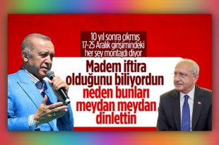 Cumhurbaşkanı Erdoğan, 17-25 Aralık kumpasında yayınlanan ses kayıtlarının sahte olduğunu 10 yıl sonra kabul eden Kemal Kılıçdaroğlu’na peş peşe sorular yöneltti. Erdoğan, “Madem iftira olduğunu biliyordun neden bunları meydan meydan millete dinlettin” dedi. Türkiye, 14 Mayıs’ta yapılacak seçimler için geri sayımda. Seçimlere 8 gün kala Cumhurbaşkanı adayları şehir şehir gezerek …