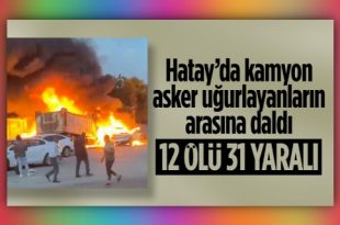 Belen ilçesinde, kamyon, asker uğurlayan kabalığın arasına daldı. Park halindeki araçlara da çarpan kamyon ve çarptığı 2 minibüs de alev alırken, kazada ilk belirlemelere göre 12 ölü 31 yaralı olduğu öğrenildi. Hatay’ın Belen ilçesinde İskenderun tarafından Antakya istikametine giden bir hafriyat kamyonunun freni patladı. Önündeki tıra çarparak yoldan çıkan kamyon …