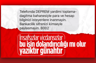 Telefonlara SMS yoluyla uyarı gönderen Bakanlık, “Telefonda deprem yardımı toplama-dağıtma bahanesiyle para ve hesap bilgilerinizi isteyenlere inanmayın. Bankacılık şifrenizi kimseyle paylaşmayın” uyarısında bulundu. Türkiye, tarihinin en büyük felaketiyle mücadele verirken, aynı zamanda çeşitli provokasyonlara maruz kalıyor. Deprem bölgelerindeki dükkanların yağmalanmasından, yardım tırlarının önünü kesen şahıslara kadar birçok olaya şahit olundu. …