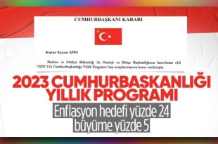 Yıllık programa göre, büyümenin Cumhuriyet’in 100’üncü yılı olan 2023’te yüzde 5 olması öngörüldü. Enflasyon hedefi ise gelecek yıl sonu için yüzde 24 olarak belirlendi… Türkiye ekonomisine ilişkin hedef ve politikaların yer aldığı 2023 Yılı Cumhurbaşkanlığı Yıllık Programı’nın onaylanmasına ilişkin Cumhurbaşkanı Kararı, Resmi Gazete’nin mükerrer sayısında yayınlandı. Hazine ve Maliye Bakanlığı …