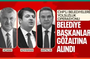 Adıyaman Belediye Başkanı Abdurrahman Tutdere, Antalya Büyükşehir Belediye Başkanı Muhittin Böcek ve Adana Büyükşehir Belediye Başkanı Zeydan Karalar sabah saatlerinde gözaltına alınırken, polisin belediye binalarında yaptıkları aramaların sürdüğü öğrenildi. Bu kapsamda da dün Antalya Manavgat Belediyesi’nin ardından bugün, Antalya, Adana ile Adıyaman Belediyesi’ne operasyon düzenlendi. İstanbul Cumhuriyet Başsavcılığı’nın yürüttüğü soruşturma …
