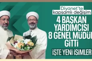 Resmi Gazete’de Cumhurbaşkanı Recep Tayyip Erdoğan’ın imzasıyla yayınlanan kararlara göre, Diyanet İşleri Başkanlığı’nda 4 yardımcı ve 8 genel müdür değişti. Geçtiğimiz günlerde Diyanet İşleri Başkanlığı’nda bayrak değişimi yaşandı. Diyanet İşleri Başkanlığı görevini Prof. Dr. Safi Arpaguş, Ali Erbaş’tan devraldı. Bu görev değişiminden sonra kurumda da köklü değişiklikler yaşanıyor. Cumhurbaşkanı Recep …