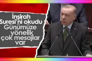 Partililere grup toplantısında seslenen Cumhurbaşkanı Erdoğan, konuşmasını İnşirah Suresi’yle sonlandırdı. Cumhurbaşkanı Recep Tayyip Erdoğan, AK Parti grup toplantısında partililere seslendi. Konuşmasında gündemi değerlendiren Cumhurbaşkanı Erdoğan, sözlerini sonlandırırken Kur’an-ı Kerim’den ayetlere yer verdi. “Sözlerimi, kelamların en güzeliyle, Rabb’imizin İnşirah Suresi’nde Peygamber Efendimiz Aleyhisselatü Vesselam hitaben bize verdiği mesajlarla bitirmek istiyorum.” diyen …