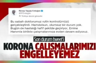 Cumhurbaşkanı Erdoğan, yakalandığı koronavirüs sonrası Emine Erdoğan ve kendisinin sağlık durumunun iyi olduğunu bildirdi. Erdoğan, çalışmalarına devam ettiğini söyledi. Cumhurbaşkanı Recep Tayyip Erdoğan ve eşi Emine Erdoğan’ın koronavirüs testleri pozitif çıktı. Yaşanan bu gelişme sonrası açıklama yapan Sağlık Bakanı Fahrettin Koca, Cumhurbaşkanı Erdoğan ile eşi Emine Erdoğan’ın hastalığı hafif geçirdiğini …