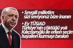 TÜSİAD'a seslenen Cumhurbaşkanı Erdoğan, Türkiye'nin çökmediğini söyleyerek, "Ey TÜSİAD Türkiye’nin çöktüğü yok Kılıçdaroğlu ile erken seçim hayalleri kurmayı bırakın." ifadelerini kullandı. Kabine Toplantısının ardından kameraların karşısına geçen Cumhurbaşkanı Erdoğan, ekonomide yeni adımları açıkladı. Döviz kurlarındaki hareketlilik ile yaşanan fiyat artışlarına değinen Erdoğan, TÜSİAD'da da sert tepki gösterdi. TÜSİAD'a seslenen Cumhurbaşkanı Erdoğan, şu ifadeleri kullandı: "Ey [...]