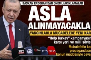 Cumhurbaşkanı Recep Tayyip Erdoğan, cuma namazı sonrası gazetecilere açıklamada bulundu. Erdoğan birçok ilimizde meydana gelen orman yangınlarına ilişkin son durumu paylaştı. Cumhurbaşkanı Erdoğan, sosyal medyada orman yangınlarıyla ilgili "Help Turkey" etiketiyle yapılan paylaşımlara ilişkin, "Help Turkey diye bir kampanya başlattılar. Bunun karşısında söyleyeceğimiz tek şey var, güçlü Türkiye. Nitekim fazla dayanamadılar kısa sürede Help Turkey'i [...]