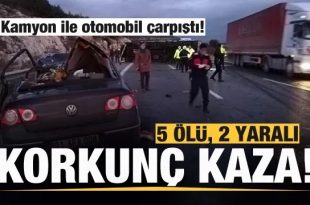 Trafik canavarı Pozantı-Ankara otoyolunun Tarsus mevkisinde kol gezdi. Pozantı-Ankara otoyolunda kamyon ile otomobilin çarpışması sonucu ilk belirlemelere göre 5 kişi hayatını kaybetti, 2 kişi de yaralandı. Kaza nedeniyle bir şeridi trafiğe kapanan yolun ulaşıma açıldığı bildirildi. Şakir Sarı'nın kullandığı 06 AB 1448 plakalı kamyon, Pozantı-Ankara otoyolunun Tarsus ilçesi Damlama mevkisinde Gazi Rüzgar yönetimindeki 01 AFA [...]