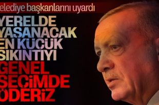 Cumhurbaşkanı Erdoğan, Belediye Başkanları İstişare ve Değerlendirme Toplantısı’nda partililere uyarıda bulunarak “Yerelde yaşanacak en küçük sıkıntının bedelini ülke çapında öderiz.” dedi. Erdoğan Belediye Başkanları İstişare Toplantısı’nda. Cumhurbaşkanı Recep Tayyip Erdoğan, AK Parti Belediye Başkanları İstişare ve Değerlendirme Toplantısı’na katıldı. Erdoğan, burada yaptığı konuşmada gündemi değerlendirerek, AK Parti’nin yerel yönetimlerdeki başarıları …