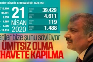 Sağlık Bakanı Koca, 21 Nisan koronavirüs tablosunun açıklanmasının ardından “Veriler bize şunu söylüyor: Ümitsiz olma, rehavete kapılma” dedi. Sağlık Bakanı Fahrettin Koca, Twitter hesabı üzerinden Türkiye’deki koronavirüs vakalarına ilişkin son verileri paylaştı. 119 KİŞİ DAHA HAYATINI KAYBETTİ Bakan Koca’nın paylaştığı verilere göre; koronavirüs nedeniyle ülkede 119 kişi daha virüse yenik …