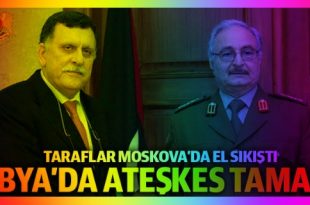 Libya’da, Cumhurbaşkanı Erdoğan ve Rusya lideri Putin’in çağrısıyla başlayan ateşkes süreci Moskova’da noktalandı. Bir araya gelen Serrac ve Hafter, süresiz ateşkes için el sıkıştı. Rus basını, Moskova’da görüşen Libya Ulusal Mutabakat Hükümeti Başkanlık Konseyi Başkanı Fayiz es-Serrac ile Libya Ulusal Ordusu lideri Halife Hafter, ön koşulsuz ve süresiz ateşkes için …